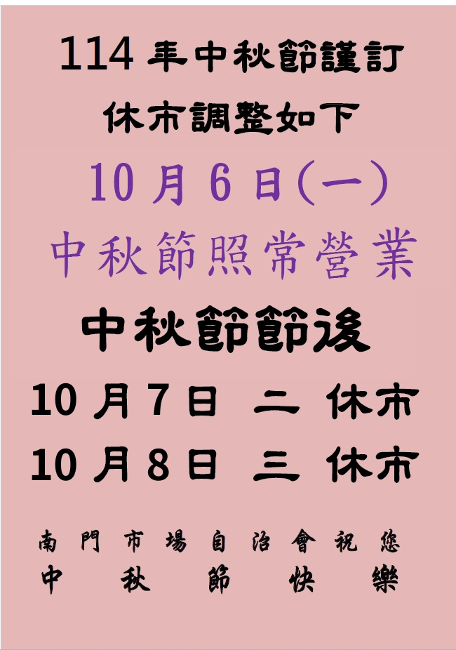 南門市場清明節休市時間:114年4月4日(五)至114年4月5日(六)