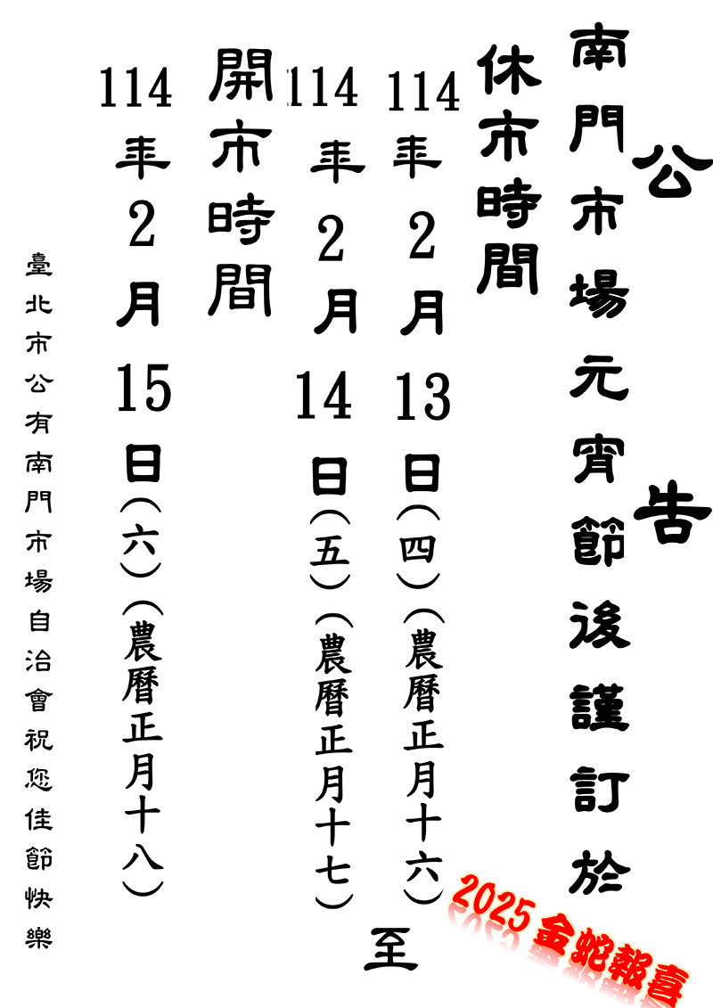 南門市場元宵期間謹於114年2月15日(六)正常營業 休市時間:114年2月13日(四)至114年2月14...